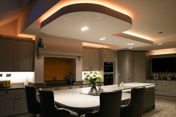 We constructed a bespoke dropped ceiling to replicate the shape of the island below it